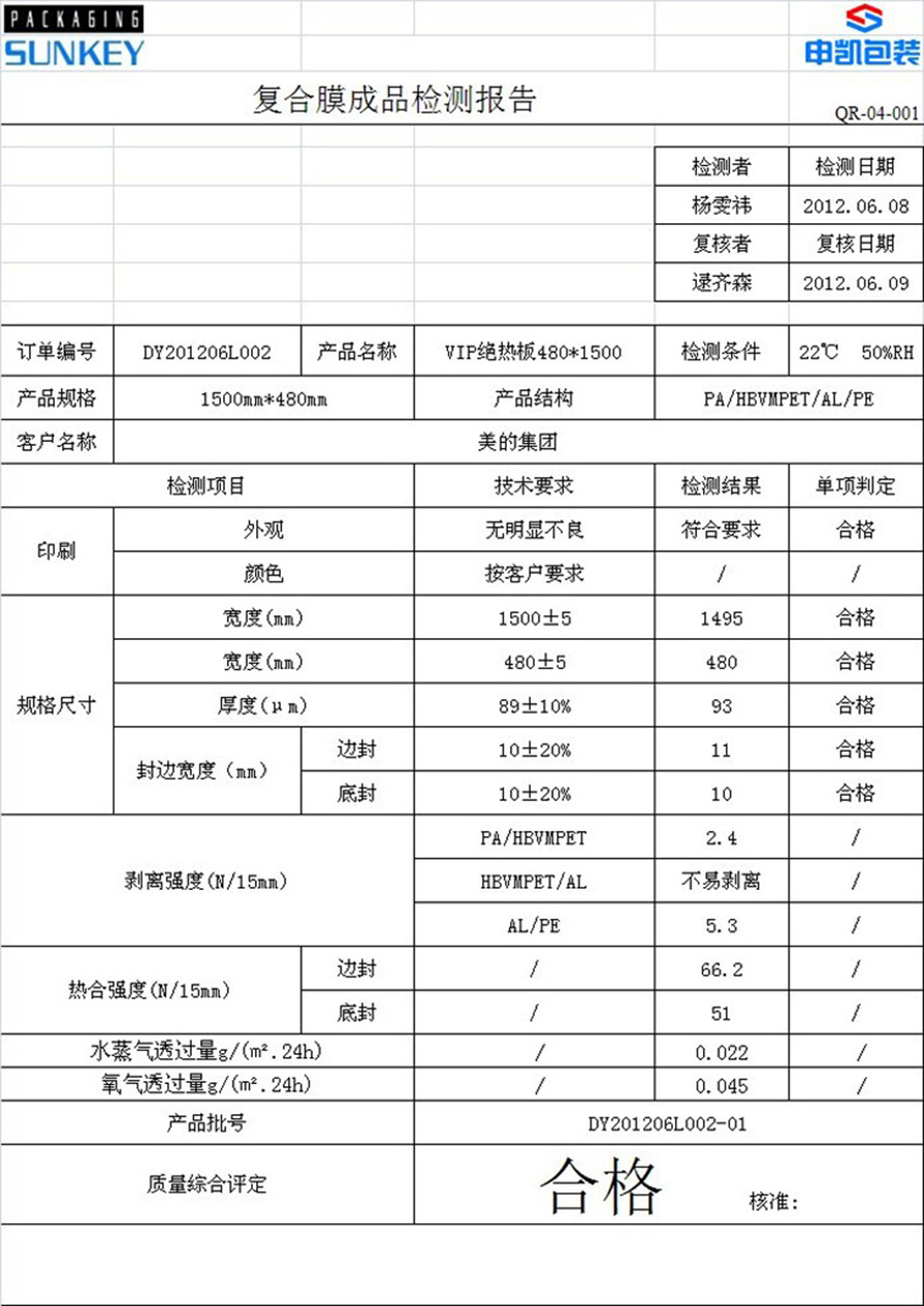2、水蒸氣透過率達到 ≤0.04g/(m2?24h),因為抽真空后上墻需要保存30年以上。 防止漏氣、漲包現象。